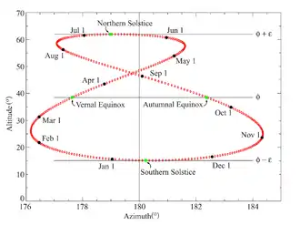 The figure in this section is an example of an analemma as seen from the Earth's northern hemisphere. It is a plot of the position of the Sun at 12:00 noon at Royal Observatory, Greenwich, England (latitude 51.48°N, longitude 0.0015°W) during the year 2006. The horizontal axis is the azimuth angle in degrees (180° is facing south). The vertical axis is the altitude in degrees above the horizon. The first day of each month is shown in black, and the solstices and equinoxes are shown in green. It can be seen that the equinoxes occur approximately at altitude φ = 90° − 51.5° = 38.5°, and the solstices occur approximately at altitudes φ ± ε where ε is the axial tilt of the Earth, 23.4°. The analemma is plotted with its width highly exaggerated, revealing a slight asymmetry (due to the two-week misalignment between the apsides of the Earth's orbit and its solstices).