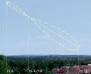 Owing to the tilt of Earth's axis (23.439°) and the Earth's orbital eccentricity, the relative location of the Sun above the horizon is not constant from day to day when observed at the same clock time each day.[1] If the time of observation is not 12:00 noon local mean time, then depending on one's geographical latitude, this loop will be inclined at different angles.