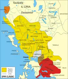 Herodotus considered the Thesprotian territory to be part of Hellas (i.e. Greece).[3] Strabo puts the Thesprotians' territory, Thesprotis, on the coast of southwest Epirus. Thesprotis stretched between the Ambracian Gulf in the south to the River Thyamis (modern-day Kalamas) in the north, and between the Pindus mountains and the Ionian Sea. The capital of Thesprotia was Cichyrus (also known as Ephyra). Other important cities of Thesprotia include Pandosia,[4] Titani, Cheimerium, Toryne, Phanote, Cassope,[5] Photice, Boucheta[6] and Batiai.[6] There was a city called Thesprotia sharing the same name with the tribe itself.[7]