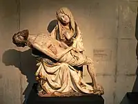 Andachtsbilder have a strong emphasis on the grief and suffering of Christ and the figures close to him. Their use was encouraged by movements such as the Franciscans, the Devotio Moderna and German mysticism in late medieval Europe, which promoted affective meditation on the sufferings of Christ by intense mental visualization ("imitation") of them and their physical effects.[5] The most extreme, even gruesome, examples often came from the eastern edge of the Holy Roman Empire and beyond in Poland, Lithuania and the Baltic states, where large carved gobbets of congealed blood can cover the body.[lower-alpha 3] But the style spread all over Europe, including Italy, although the extremes of emotionalism were avoided there until the Baroque.