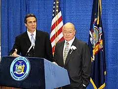 On July 23, 2007, Cuomo's office admonished the Spitzer administration for ordering the New York State Police to keep special records of then Senate majority leader Joseph Bruno's whereabouts when he traveled with police escorts in New York City.[44] At the discretion of top officials of the Spitzer administration, the created documents meant to cause political damage to Bruno.[45] Spitzer responded by accepting responsibility and issuing an apology to Bruno.[44][46]