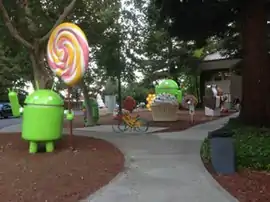 The Android lawn statues are a series of large foam statues near the Googleplex (Google's headquarters) in Mountain View, California, currently located at Charleston Rd & Huff Ave. They are based on the code names for versions of Google's Android mobile operating system, which were named after desserts and sweet treats. Google used to commission a statue for each new Android version, a tradition that ended in 2019 after the release of Android 10. Starting with Android 11, the statues are created as virtual 3D models.[1]