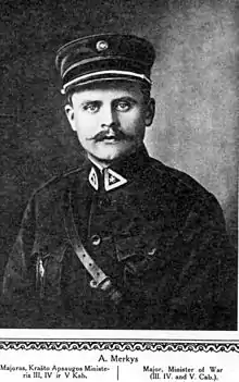 After the Klaipėda Revolt of 1923, Merkys became secretary to the Klaipėda Region Commissioner, Antanas Smetona. Following the 1926 Lithuanian coup d'état, he became Minister of Defence again until 1927, when he was made Governor of Klaipėda Region. In 1932, German demands prompted his removal as Governor and Merkys returned to practising law.[1] He became Mayor of Kaunas in 1933 and served in this position until 1939.[2] In 1936 was elected to the Fourth Seimas of Lithuania. On 17 November 1939 he became Prime Minister.