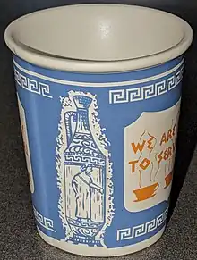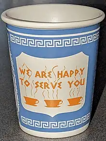 The cup was originally designed by Leslie Buck of the Sherri Cup Company in 1963,[1] to appeal to Greek-owned coffee shops in New York City, and was later much copied by other companies.[2] Sherri was later acquired by the Solo Cup Company,[1] which in turn was acquired by Dart Container in 2012.[3] The name is said to come from Buck's Eastern European-accented pronunciation of the word amphora.[1]