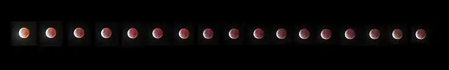 Totality lasted only 4 minutes and 43 seconds,[1] making it the shortest lunar totality in almost five centuries since 17 October 1529 (which lasted 1 minute and 42 seconds). It was claimed by some that due to the oblateness of the Earth, it may have actually just been a partial eclipse.[2] It was the sixth total lunar eclipse out of nine with totality under 5 minutes in a five millennium period between 2,000 BC and 3,000 AD. The eclipsed moon was 12.9% smaller in apparent diameter than the supermoon September 2015 lunar eclipse, measured as 29.66' and 33.47' in diameter from the center of the Earth. It occurred 3 days past apogee at 29.42'.