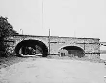 The Aqueduct Bridge's Washington abutment and a remnant of the bridge's Virginia abutment still survive. Both are located a short distance west (upstream) of the Key Bridge.[74] The southern arch of the Washington abutment shelters rowing shells belonging to members of the Potomac Boat Club.[79] Between the abutments, the preserved pier remains in place near the river's Virginia shoreline.[74]