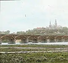Proposals were made to replace Aqueduct Bridge as early as 1901.[35] But these proposals were delayed when the McMillan Plan was issued in 1902.[36] Congress approved the construction of a wooden superstructure that extended outward from the upstream side of the bridge's deck to carry electric trolleys between Georgetown and Rosslyn in 1902.[37] Construction began in May 1903, and involved reconstruction of one of the bridge's piers.[38] Built by the Great Falls and Old Dominion Railroad, trolleys of the railroad and its successor, the Washington and Old Dominion Railway, traversed the bridge until its closure in 1923.