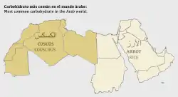 Maghreb cuisine is the cooking of the Maghreb region, the northwesternmost part of the Arab world along the Mediterranean Sea, consisting of the countries of Algeria, Libya, Morocco, Tunisia, and Mauritania. In Maghrebi cuisine, the most common staple foods are wheat (for khobz bread[22] and couscous[23]),[24] fish, seafood, goat,[25] lamb,[25] beef,[25] dates, almonds, olives and various vegetables and fruits.[26]