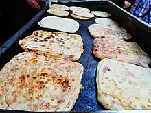Libyan cuisine derives much from the traditions of Maghreb and Mediterranean cuisines. One of the most popular Libyan dishes is bazin, an unleavened bread prepared with barley, water and salt.[27] Bazin is prepared by boiling barley flour in water and then beating it to create a dough using a magraf, which is a unique stick designed for this purpose.[28] Pork consumption is forbidden, in accordance with Sharia, the religious laws of Islam.[29] Tripoli is Libya's capital, and the cuisine is particularly influenced by Italian cuisine.[29] Pasta is common, and many seafood dishes are available.[29] Southern Libyan cuisine is more traditionally Arab and Berber. Common fruits and vegetables include figs, dates, oranges, apricots and olives.[29]