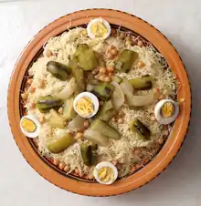 Kabsa (Arabic: كبسة kabsah) or makbūs/machbūs (مكبوس/مچبوس Gulf pron.: [mɑtʃˈbuːs]) is an Arab mixed rice dish that originates from Yemen.[14] It is commonly regarded as a national dish in all the countries of the Arabian Peninsula. It can also be found in regions such as southern Iran, Gaza in Israel,[15] and the Malabar Coast of India.
