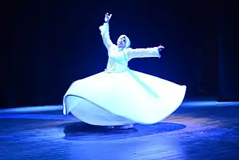 Tanoura (Arabic: التنورة) Is an Egyptian folk dance with obvious Sufi origins,[48] which today became an important ritual of the celebration rituals performed on many occasions.[49] The dance is a rhythmic dance performed collectively by circular movements, which stems from the mystical Islamic sense of philosophical basis.[50] It sees that the movement in the universe starts from a point and ends at the same point and therefore reflects this concept in their dance.[51] Their movements come as if they are drawing halos, drenched in space. The word tanoura or tannoura refers to the colorful skirt worn by the whirler, with a color representing each Sufi order.[52]