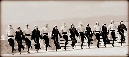 Dabke (Arabic: دبكة), is a Levantine folk dance event forming part of the shared sociocultural landscape of Jordan, Palestine, Lebanon and Syria.[34] Twice, Dabke was made into a fixed canon of movement patterns and steps which, through repeated execution, served to consolidate behavioral norms and cultural meanings.[35]