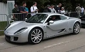 The Farboud GT was the company's first model, announced in 2002 at the Autosport International show in Birmingham. It featured a 2.8-litre V6 twin turbo engine producing 620 bhp.