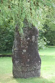 The date of the foundation of Arbirlot Kirk, dedicated to St Ninian is unknown, although dates as early as the first decades of the 400s have been proposed.[13]: 93, 94 [14]: 52, 54 The current manse garden contains a standing stone (illustrated) with what are thought to be medieval[15] carvings, although much earlier dates have also been suggested.[14]: 94 [16]: 83.84 The stone was retrieved from the foundations of the parish church during re-building works in 1831.[15]