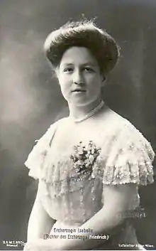 Archduchess Isabella Maria Theresia Christine Eugenie of Austria-Teschen (17 November 1888 – 6 December 1973) was a daughter of Archduke Friedrich, Duke of Teschen and his wife, Princess Isabella of Croÿ.[1] She was a member of the House of Habsburg-Lorraine (her grandfather, Archduke Karl Ferdinand of Austria, was a grandson of Holy Roman Emperor Leopold II).