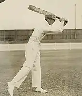 His contemporaries noted his classical style. The journalist A.R.B. Palmer described his cover drive as "... perfectly balanced and true ... the bat seems a whip in his hands."[67] Clem Hill, the former Australian captain, noted Jackson's sparkling footwork, watching close enough to notice that his toes turned in as he walked.[14] Like Kippax, whose style was uncannily similar, Jackson wore his shirt-sleeves almost down to his wrists. This was not in imitation but to conceal the blemishes on his arms caused by psoriasis. Kippax was not seen by some as the best person to imitate, with Charles Kelleway critical of Jackson's flourishes, wishing he would not be so, "... cramped in copying other batsman's styles".[68]