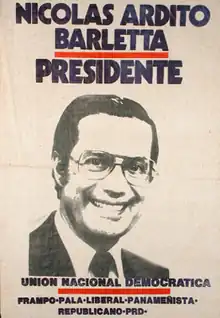Voting day on 6 May 1984 was peaceful, but violence led by Arias's supporters broke out the next day in front of the Legislative Palace, where the electoral board was meeting. One person was killed. The opposition charged that there was electoral misconduct and fraud. The candidates for congress on both sides challenged the vote count at the district level, delaying the final count. Meanwhile, both sides claimed victory. When the initial results showed Arias, who had the support of much of the opposition, on his way to a landslide victory, Noriega halted the count.[3][4] After brazenly manipulating the results, the government announced that Barletta had won by a slim margin of 1,713 votes.[5] Independent estimates suggested that Arias would have won by as many as 50,000 votes had the election been conducted fairly.[6] More than 60,000 votes were not included in the final count.[7] On 16 May 1984, the district results were finally tallied by the Electoral Tribunal and Ardito Barletta was declared the winner by 1,713 votes, defeating Arias. The U.S. government was aware of this manipulation, but chose not to comment on it.[8] Noriega's rule became increasingly repressive,[3] even as the U.S. government of Ronald Reagan began relying on him in its covert efforts to undermine Nicaragua's Sandinista government.[9] The U.S. accepted Barletta's election, and signaled a willingness to cooperate with him, despite recognizing the flaws in the election process.[10] During the election, the American Institute for Free Labor Development and the National Endowment for Democracy additionally provided around $20,000 in support of activists involved with Ardito Barletta's campaign, despite opposition from certain U.S. legislators such as Representative Hank Brown and Senator Edward Zorinsky, alongside Ambassador Everett Ellis Briggs.[11][12]