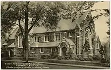 The Ardmore Presbyterian Church is a congregation of the Presbyterian Church located at the corner of Montgomery Avenue and Mill Creek Road. The Gothic exterior of the church building is gray stone, with granite trim, and the interior is hardwood.[25] The original church, now the chapel, was constructed in 1910 following the 1907 establishment of the congregation, whose 50 members worshipped at the local Masonic Hall in the meantime.[25] The first service in the new building was held in September 1910.[25] The current sanctuary, designed by Thomas, Martin & Kirkpatrick,[26] was dedicated in 1924. Subsequent additions were built in 1931 and the 1950s.