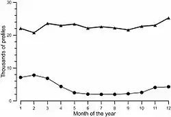 One consequence of the use of profiling floats to sample the ocean is that seasonal bias can be removed. The diagram opposite shows the count of all float profiles acquired each month by Argo south of 30°S (upper curve) from the start of the program to November 2012 compared with the same diagram for all other data available. The lower curve shows a strong annual bias with four times as many profiles being collected in austral summer than in austral winter. For the upper (Argo) plot, there is no bias apparent.