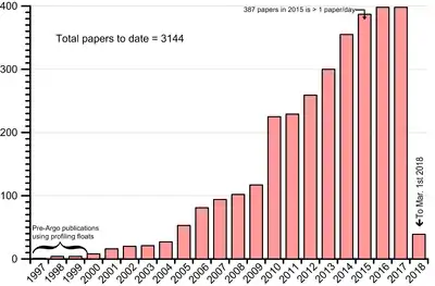 The Argo Steering Team made a 10-year report to OceanObs-2009 [5] and received suggestions on how the array might be improved. These suggestions included enhancing the array at high latitudes, in marginal seas (such as the Gulf of Mexico and the Mediterranean) and along the equator, improved observation of strong boundary currents (such as the Gulf Stream and Kuroshio), extension of observations into deep water and the addition of sensors for monitoring biological and chemical changes in the oceans. In November 2012 an Indian float in the Argo array gathered the one-millionth profile (twice the number collected by research vessels during all of the 20th century) an event that was reported in several press releases.[6][7] As can be seen in the plot opposite, by early 2018 the Bio-Argo program is expanding rapidly.[8]