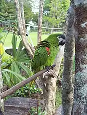 The Arini tribe of the neotropical parrots is a monophyletic clade of macaws and parakeets (commonly called conures in aviculture) characterized by colorful plumage and long, tapering tails. They occur throughout Mexico, Central America, and South America, the Caribbean and the southern United States. One genus and several species are extinct; another genus is extinct in the wild. Two species are known only through subfossil remains. About a dozen hypothetical extinct species (see Extinct Caribbean macaws) have been described, native to the Caribbean area.[1][2] Among the Arini are some of the rarest birds in the world, such as Spix's macaw, which is extinct in the wild – fewer than 100 specimens survive in captivity. It also contains the largest flighted parrot in the world, the hyacinth macaw. Some species, such as the blue-and-yellow macaw and sun conure are popular pet parrots.