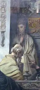 Aristodemus' representation in Plato's Symposium has given rise to debate, as scholars have interpreted his character as hubristic,[9] or instead humble and pathetic.[10] Although the drinking party depicted in the Symposium involved each guest discoursing on the nature of Eros, Aristodemus' own speech was either passed over unreported or never given, perhaps due to his perceived insignificance.[4][11]