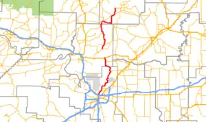 AR 107 begins at Interstate 40 in North Little Rock and runs through some suburbs until entering Faulkner County. The route runs north to terminate at US 64B in Vilonia. AR 107 has 16.4 miles (26.4 km) in Pulaski County and 6.4 miles (10.3 km) in Faulkner County.[2][3]