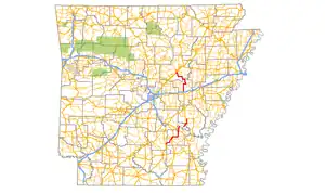 Arkansas Highway 11 (AR 11 and Hwy. 11) is a designation for three state highways in Arkansas. One segment of 36.23 miles (58.31 km) runs from US Route 63 (US 63) at Pansy to Huff Island Public Use Area near Grady.[1][2] A second segment of 12.83 miles (20.65 km) begins just across the Arkansas River at the eastern terminus of Highway 88 at Reydell and runs north to US 65 west of De Witt.[3][4] A third route of 37.53 miles (60.40 km) runs from Interstate 40 (I-40) and US 63 in Hazen north to Highway 367 in Searcy.[5]