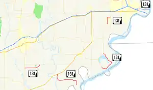 Highway 131 begins at Highway 147 at Bruins near Porter Lake and runs clockwise through the town of Horseshoe Lake. The road continues around the Horseshoe Lake to terminate at Highway 147 at Thompson Grove.