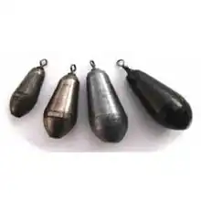 The Arlesey Bomb is an angling weight developed by Richard Walker at the lake in Arlesey. Walker fished for perch in the lake, and very large perch could be caught in the deepest water. The Arlesey Bomb was developed to allow him to cast the long distances required.[1] It is tear-shaped, with a loop at the top to attach the line. Its shape makes it aerodynamic to cast, but unlikely to snag on the river or lake bottom. The incorporation of a swivel also prevented the line getting twisted.[2]