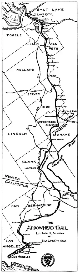 The Arrowhead Trail or Arrowhead Highway was the first all-weather road in the Western United States that connected Los Angeles, California with Salt Lake City, Utah by way of Las Vegas, Nevada. Built primarily during the auto trails period of the 1910s, prior to the establishment of the United States Numbered Highway System, the road was replaced in 1926 by U.S. Route 91 (US 91) and subsequently Interstate 15 (Iโ15).[4][5] Small portions of the route in California, Nevada (Las Vegas Boulevard) and Utah are sometimes still referred to by the name, or as Arrow Highway.