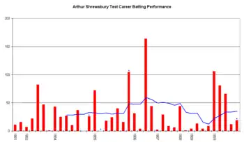 1887 proved to be Shrewsbury's best season, with 1653 runs at 78.71.[8] His batting average was the highest so far achieved, narrowly beating W. G. Grace's record of 78.25 in 1871. Shrewsbury made consecutive scores of 119, 152, 81, 130 and 111, and finished the season with his highest first-class score of 267 against Middlesex.[28] During the season Shrewsbury scored his 10,000th first-class run.[29]