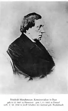 August Friedrich Otto Münchmeyer was a German neo-Lutheran pastor. He was born in Hanover on 8 December 1807 and he died in Buer (10 miles north Essen), Münster on 7 November 1882.