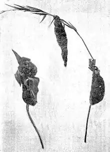 Females usually attach their egg sacs on vegetation and other surfaces near the edges of their webs (including grass blades, leaves, and twigs). They are usually bound longitudinally with loose lengths of silk, but they can sometimes be found dangling.[16][37] The egg sacs are around 15 to 35 mm (0.59 to 1.38 in) in length and can vary in shape from circular to pointed at both ends. They are reddish brown to golden brown in colour, though rarely they may also be bright yellow. They are made from closely woven silk.[16][32][38]