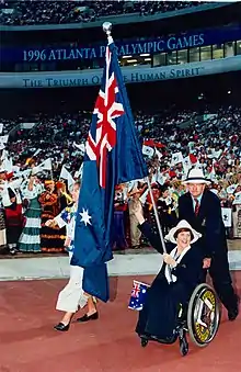 Libby Kosmala was the flag bearer at the opening ceremony, wheeled by the basketball wheelchair mechanic Graham Gould. Libby has represented Australia at 12 Paralympic games in shooting, amassing 13 medals, 9 of which are gold.[9]