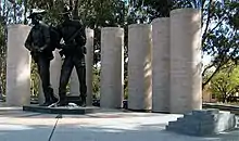 The two central figures represent two Australian soldiers facing the east and the rising sun, and represent the importance of support and comradeship represented in the Australian term, 'mates'. They wear the distinctive Australian slouch hat that carries the 'Rising Sun' badge. The figures stand on a raised podium paved in a radial pattern which refers to the Army insignia. Seven pillars represent the seven major conflicts in which the Australian Army was involved during the 20th century. They are surrounded by water, symbolic of the long sea journeys involved in Australian campaigns.[1]