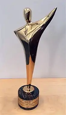 When the Australian Film Institute launched the Australian Academy of Cinema and Television Arts, it set out to create a new gold cast statuette.[45] The statuette, which will be handed out from 2012, for the inaugural AACTA Awards, had to "reflect the prestige and heritage of the Awards[...] but which was above all distinctly Australian", while incorporating the Southern Cross constellation and the human spirit.[45] After receiving submissions from Australian artists, with their interpretations of the design brief, a statuette designed by sculptor Ron Gomboc became the winning design.[45] The statuette, which has a 22 karat gold body, whose human form takes on the shape of the Southern Cross, on a tiger iron gemstone base, was designed over three months at Gomboc's home in Western Australia, before it was presented to the AFI board in June 2011.[45][46][47] Gomboc worked with stone artist, Richard Williamson, who cut and polished each individual gemstone base for the statuette, with each base representing "[...] the unique talent and contribution to the industry of every AACTA Award recipient."[45][46] When the statuette was unveiled at the launch of the Academy by Geoffrey Rush, he announced that a competition to name the award would commence, where people could log onto the Academy's Facebook page and post potential names on its wall.[48] In the media it was well received, with Gary Maddox from the Sydney Morning Herald comparing it to the previous statuette, stating that it, "looks less like a lethal doorstop and more like a stylised Oscar, possibly Oscar's flamboyant brother waving 'hi'".[49] The AACTA Award statuette remains the property of the Australian Film Institute, and is to remain with the winner and their heirs and descendants.[50] It cannot be sold to a third party and if it were to part from the winner or their heir and descendants, the Academy reserves the right to repurchase it for one dollar.[50] The award may, however, have its ownership transferred to a museum, gallery or other not-for-profit institution, at the AFI's discretion.[50]