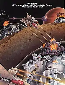 Four outposts are located in the center of a scrolling playfield, and the player must protect them from waves of enemy attackers. A flight-style joystick moves the player's tank; a trigger on the joystick shoots; a separate knob rotates the tank's turret independently of movement; and a button activates a scanner which shows where offscreen enemies are.