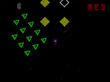 Aztarac is a scrolling multidirectional shooter with color vector graphics. It was developed by Tim Stryker (1954–1996) and released in arcades by Centuri in 1983. The player commands an intergalactic race of mutant humans whose mode of transport is a tank. Its turret is independently controlled, allowing the player to move in one direction while shooting in another. The mission is to guard space outposts from hordes of incoming enemy ships. Aztarac's color vector graphics were impressive at the time of release, and a circular plastic lens over the screen accentuates the visuals. Few machines were produced, though the exact number is unclear. Centuri only developed two vector games; Aztarac was the second.[2]