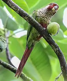 The Azuero parakeet (Pyrrhura eisenmanni), also known as the Azuero conure, is a parrot that inhabits the Azuero Peninsula of Panama. Formerly classified as a subspecies of the painted parakeet, it is now considered its own species.[1] The Azuero parakeet prefers humid, hilly, and forested areas. It feeds on fruits, flowers, seeds, algae, and invertebrates. The Azuero parakeet prefers to stay in flocks of around 20 individuals. It prefers to stay high up in forest canopies.[2]