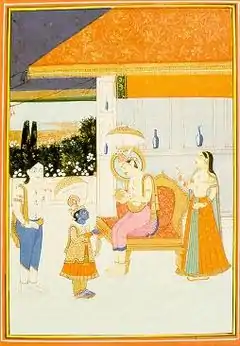 ![]() Vamana (blue faced dwarf) in the court of King Bali (Raja Bali, right seated) seeking alms | |