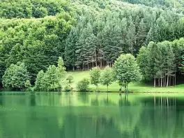 Balkana (Bosnian/Serbian cyrillic: Балкана) is an artificial lake located on the slopes of Lisina mountain, in the municipality of Mrkonjić Grad, entity of Republika Srpska, in the western part of Bosnia and Herzegovina. The lake, actually, consists of two separate, though connected via small outcomes, basins, upper as larger and lower as smaller, with very small difference in water tables levels. Total area of both basins is 56.000 m2 (602.78 sq ft). Balkana gets its waters from several mountain springs and two small mountain streams, Cjepalo and Skakavac, while its outflow is Crna Rijeka (English: Black River), which runs through Mrkonjić Grad from south to north, and joins Vrbas after 17 km (11 mi).