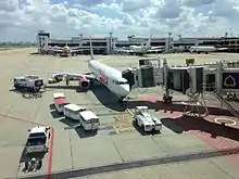 The airport is considered to be one of the world's oldest international airports and Asia's oldest operating airport.[1] It was officially opened as a Royal Thai Air Force base on 27 March 1914, although it had been in use earlier. Commercial flights began in 1924, making it one of the world's oldest commercial airports. The airport consists of Terminal 1 for international flights and Terminal 2 for domestic flights which are connected by a unique glass exterior elevated walkway. The airport also featured an exterior walkway connected to the Amari hotel. The first commercial flight was an arrival by KLM Royal Dutch Airlines.[2]