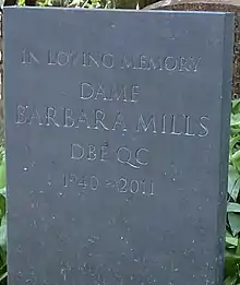 Dame Barbara Mills died on 28 May 2011, aged 70, after suffering a stroke 12 days earlier. She was survived by her husband, their four children, and eight grandchildren.[2][8] Her ashes are interred in Highgate Cemetery (west cemetery).