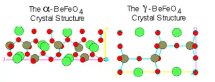 Barium ferrate is the chemical compound of formula BaFeO4. This is a rare compound containing iron in the +6 oxidation state.[2] The ferrate(VI) ion has two unpaired electrons, making it paramagnetic.[3] It is isostructural with BaSO4, and contains the tetrahedral [FeO4]2− anion.[4]