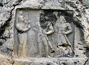 ![]() Sasanian king Bahram II offering a lotus flower to his wife | |