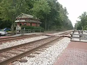 ![]() The station shelter and platform on the Washington-bound side of Barnesville station, as seen from the Martinsburg-bound platform. | ||||||||||||||