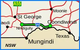 | Goondiwindi | Goondiwindi | 154.0 | 95.7 | Barwon Highway turns north as West Street[5] The route to the Cunningham and Newell highways (also signed as State Route 85) continues through Goondiwindi as Lagoon Street, Russell Street, Albert Street and Marshall Street to the intersection described at the bottom of this table | |