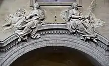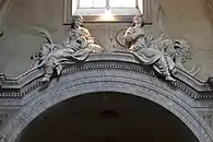 Bernini added the two halves of a broken segmental pediment on the sides of the upper level, replacing the original volutes, and the curved connecting element with the rich oak garlands. Further Baroque additions were the two flaming torches and the six mountains, the family symbols of the Chigi dynasty. The plain pediment was originally decorated with the coat of arms of Pope Sixtus IV hanging on an acanthus leaf scroll corbel but only the truncated upper part of the shield survived.