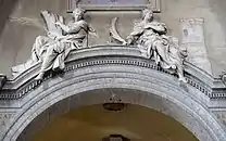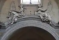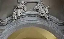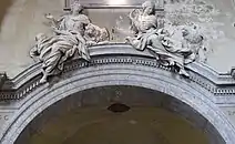 The main door is more monumental that the others. Its pointed pediment is filled with a sculpture of the Madonna and the Child set in a scallop shell. The rim of the niche is decorated with cherubs among six-pointed stars and whiffs of clouds. The frieze has a fine carved decoration of artificial foliage, pecking birds and three putti who are holding torches and oak branches in their hands and carrying bowls of fruit on their heads. The coat-of-arms of Pope Sixtus IV on the lintel is encircled by oak branches. The carvings around the door are the only significant sculptural decorations on the façade and as a whole they summarize the iconographic program of the Sistine rebuilding. The central motif is the Madonna del Popolo surrounded by the symbols of heavenly light and paradisiacal abundance, intertwined with the emblem of the Della Rovere dynasty, and set in a perfectly classical frame.